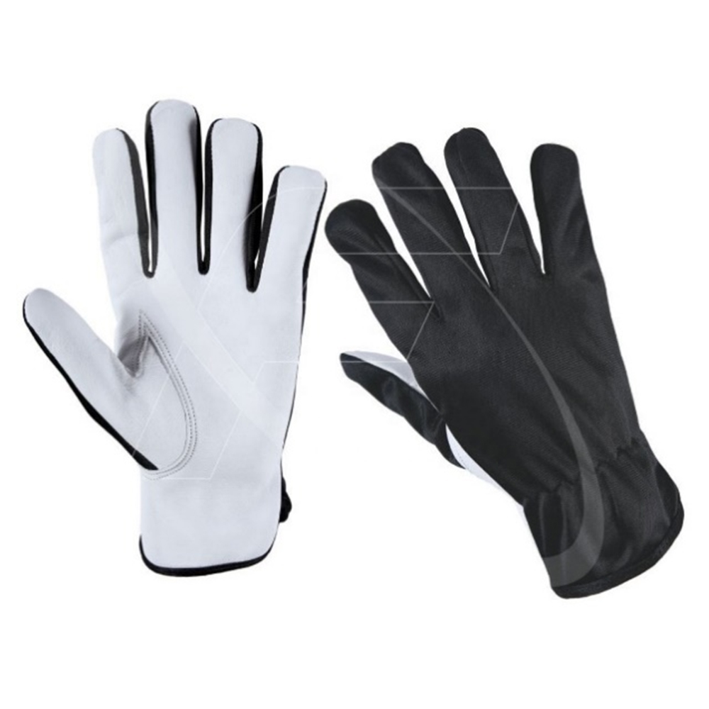 * Leather Work Gloves Palm Made of Goatskin Leather with Black Polyester Fabric Back.